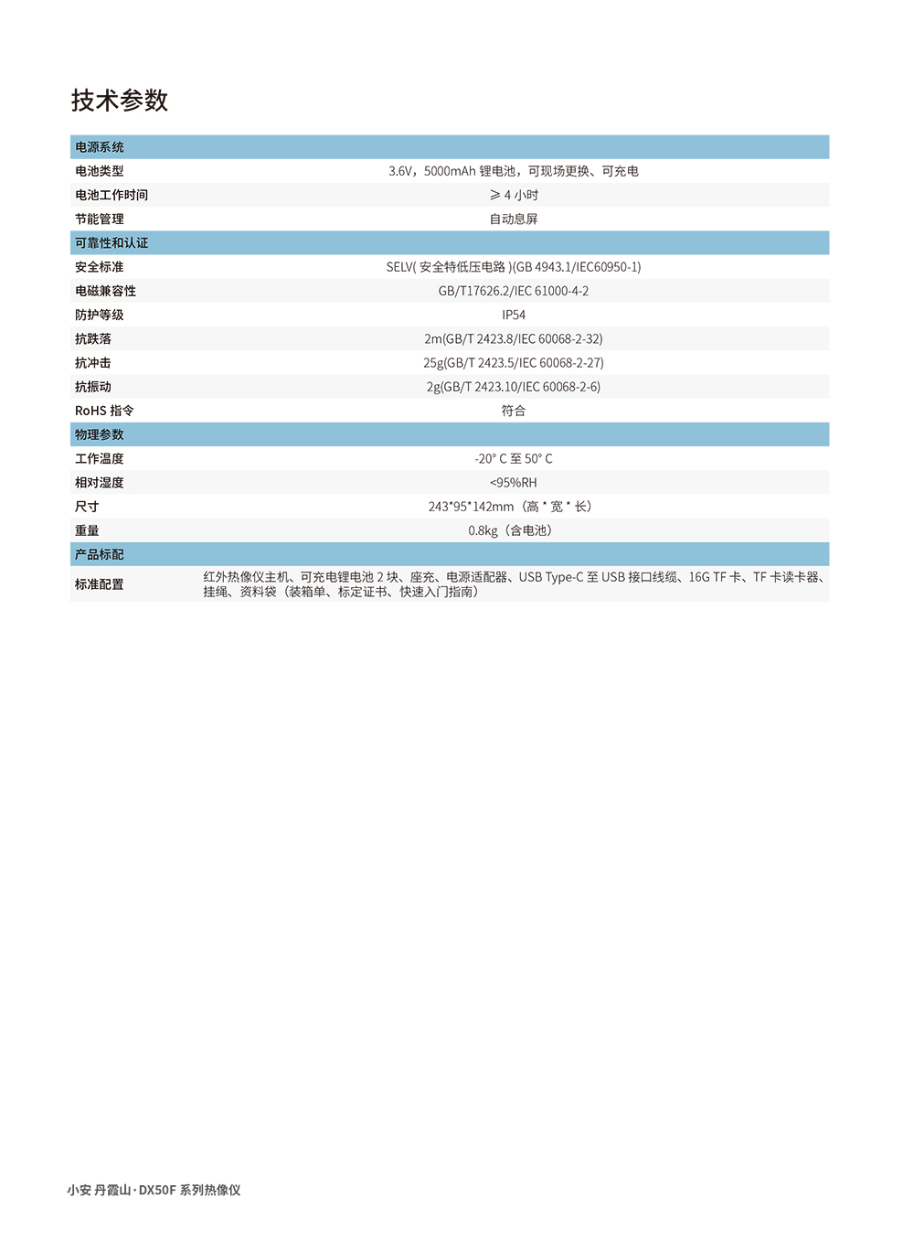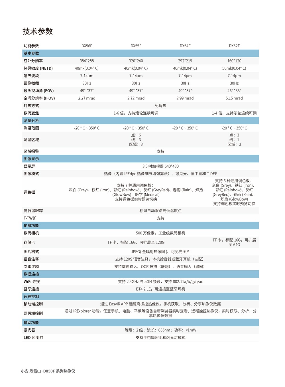 红外分辨率:384*288(DX56F), 320*240(DX55F), 292*219(DX54F), 160*120(DX52F),测温范围:-20℃~350℃,对焦方式:免调焦,镜头视场角:49°x37°/46°x35°(DX52F)