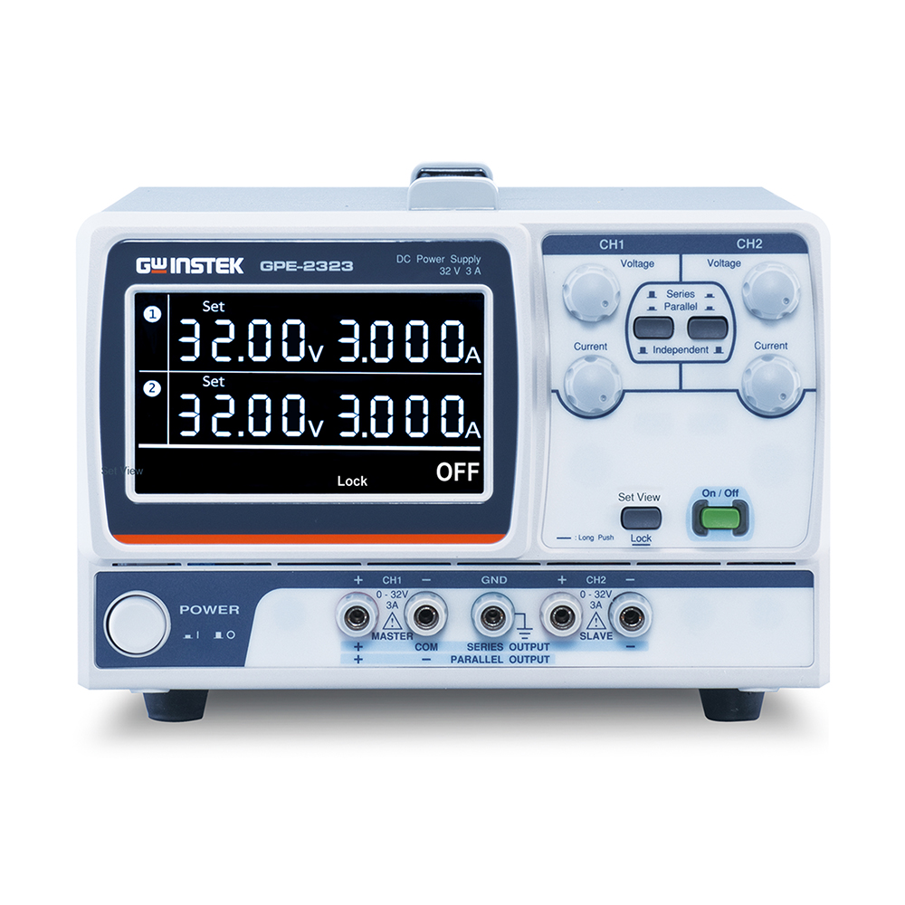 GPE-系列线性直流电源秉持了固纬电子在电源研发生产领域一贯的技术质量优势,GPE-系列提供大屏幕LCD 显示、高测量分辨率, 简易外部类控制、智能型温控风扇等显著优势不胜枚举,GPE-系列为线性直流电源,产品信道数为1/2/3/4最大电压及电流配置为32V/6A(for GPE-1326), 32V/3A(for GPE-2323/3323/4323), 其提供的设定及回读分辨率为10mV/1mA. 主要的应用为一般的电子行业,学术研究实验室或个人研究工作室等单位使用。