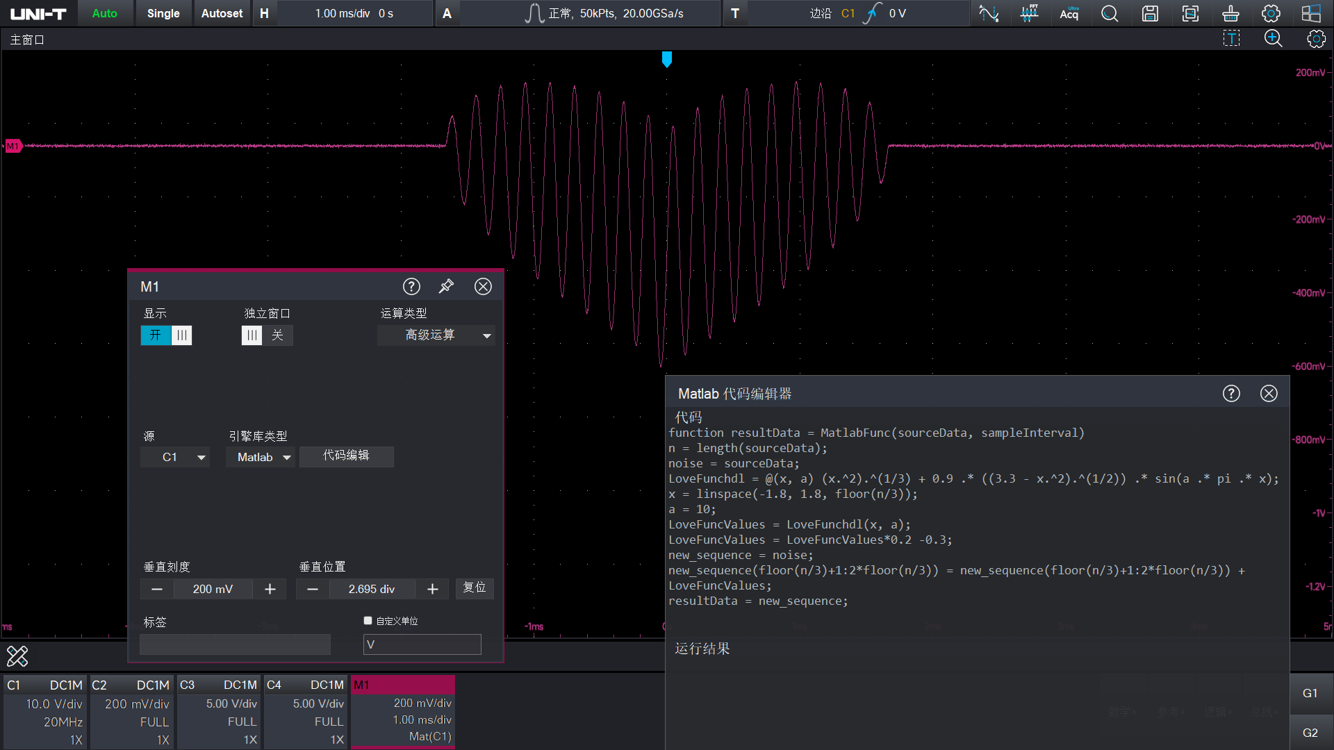 利用Matlab强大的数学库,您可以自定义编写数学算法,MSO8000HD 可以直接运行Matlab代码,并将结果直接显示在示波器界面中。 同时也提供了增强型FFT、基本运算和几十种高级公式组合编辑,其强大的数学分析功能,满足您更多分析需求!