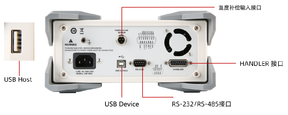 RS-232/RS-485接口:使用SCPI和Modbus RTU协议与计算机、PLC或WINCE设备进行通讯,高效完成远程控制和数据采集功能。 USB Device:可以简化计算机与仪器进行通讯。 HANDLER 接口:用于实现联机操作,方便与用户系统控制组件完成自动控制。 温度补偿传感器输入接口:仪器内置温度补偿接口,补偿因环境温度引起的测试误差。 USB Host接口:用于数据或屏幕截图保存。