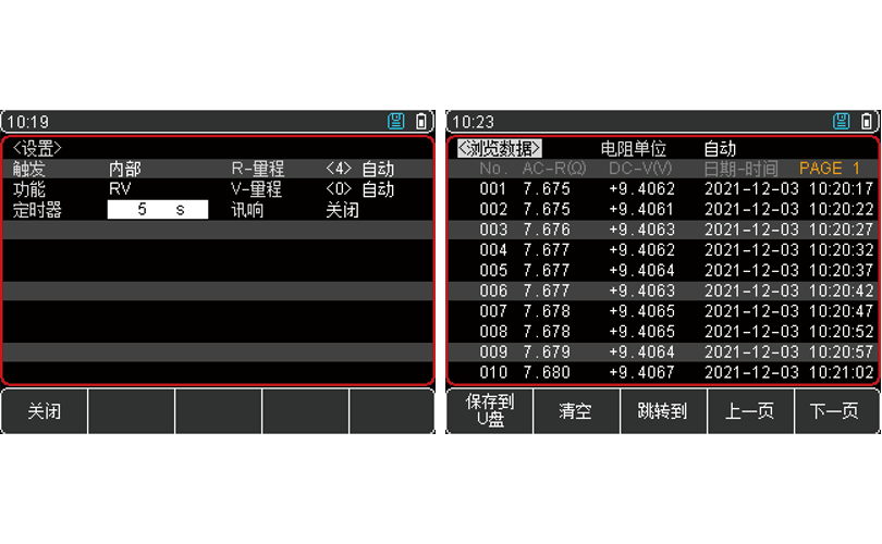 可根据需要设置定时测试时间,自动测试保存测试数据到本机,最多可一次性保存500组数据,可导出.csv格式测试结果到U盘,方便数据分析。