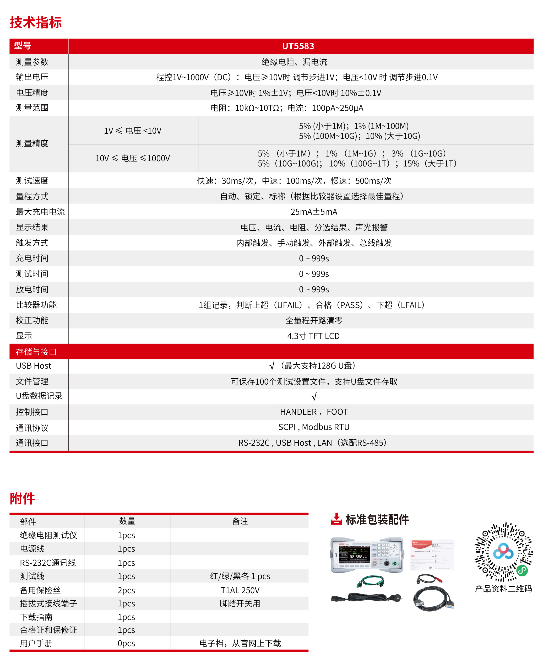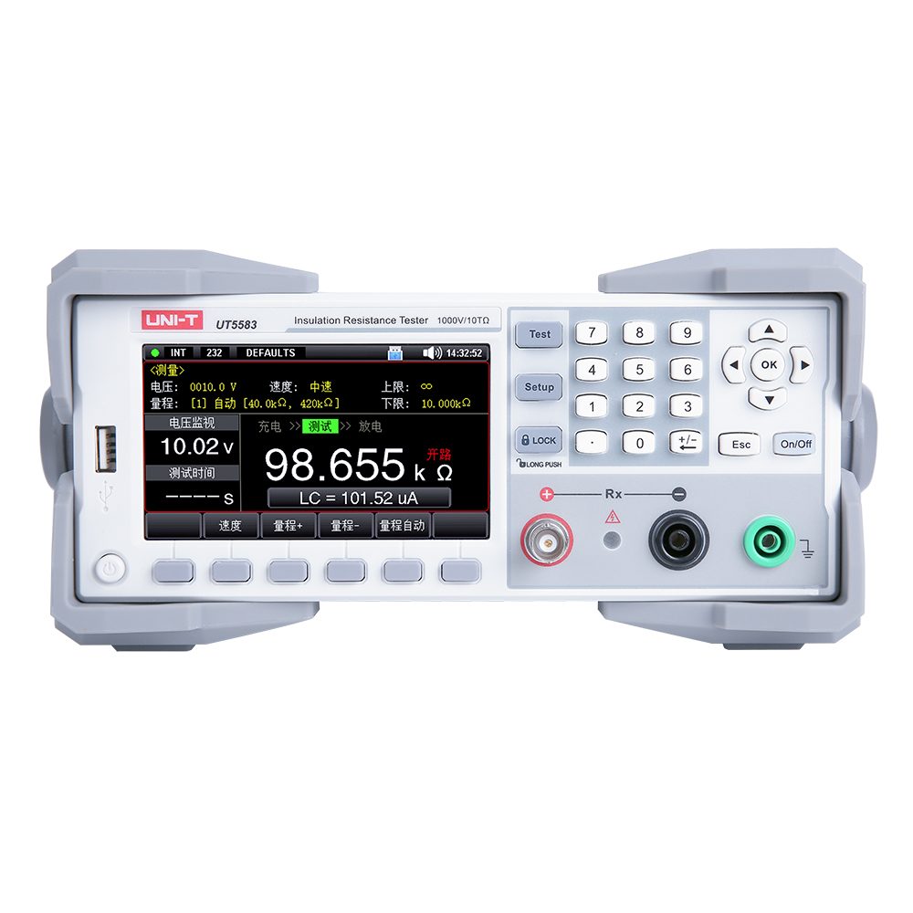 UT5583绝缘电阻测试仪采用高性能处理器控制,4.3寸 TFT-LCD显示。输出电压可任意设置1V~1000V,满足大部分测试需求。六量程测试,绝缘电阻测量范围可达10kΩ~10TΩ,高达30ms/次的采样速率,丰富的通讯接口,为自动化生产提供了优选测试解决方案。