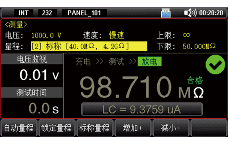 ● 采用 4.3 英寸 TFT-LCD 显示,简洁面板操作 ● 输出电压实时监视 ● 绝缘电阻、漏电流双显示 ● 充电时间、测试时间、放电时间可调 ● 校正功能,全量程开路清零 ● 针对容性材料的接触检查功能 ● 选择位数显示功能 (5 位/4 位) ● 比较器功能,实现合格、不合格分选 ● 分选判断音设置功能 ● 快速放电功能 ● U 盘数据记录 ● 可存储 100 个测试文件,支持 U 盘文件存取 ● 接口丰富,支持 SCPI 和 MODBUS 两种协议