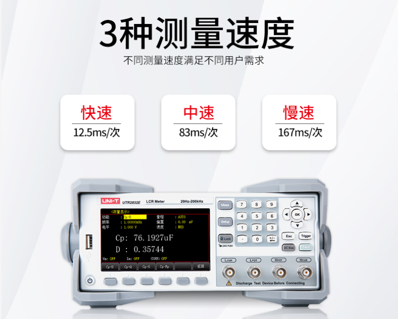 UTR2830E系列LCR数字电桥采用4.3英寸 TFT-LCD显示屏,最高可支持四参数同时显示,测试频率20Hz~300kHz,全数字键盘,搭配实时操作系统,操作更简便,0.05%的基本精度,比较器支持10档分选,测试更可靠。可满足生产线质量保证、进货检验及自动化生产,实验室测试的需求。