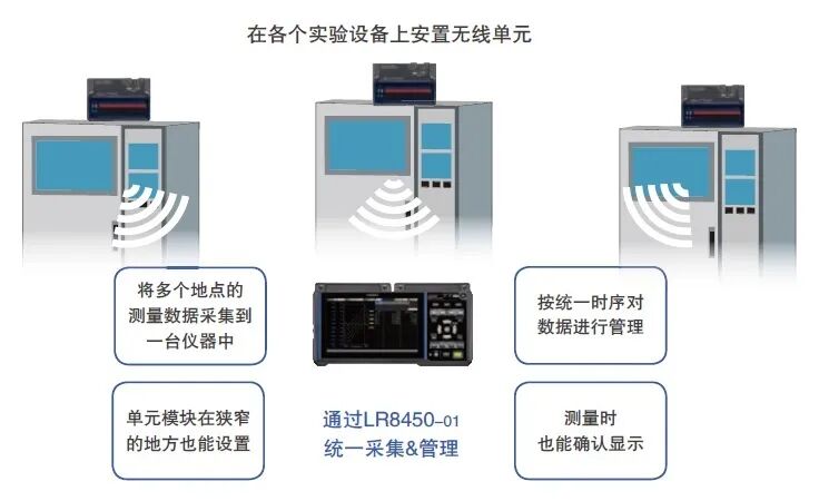 LR8450-01还能在此基础上再通过无线连接7个无线单元,也就是4个电压/温度单位U8552(30个通道)加上7台无线电压/温度单元LR8532(30个通道)。这样可以使用1台LR8450-01总共测量330个通道的电压和温度。